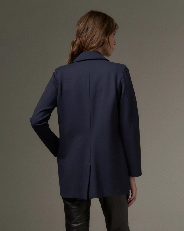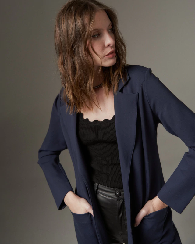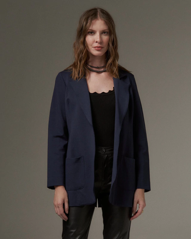 Blazer desenvolvido em malha. O modelo possui o comprimento levemente alongado, com dois bolsos frontais.