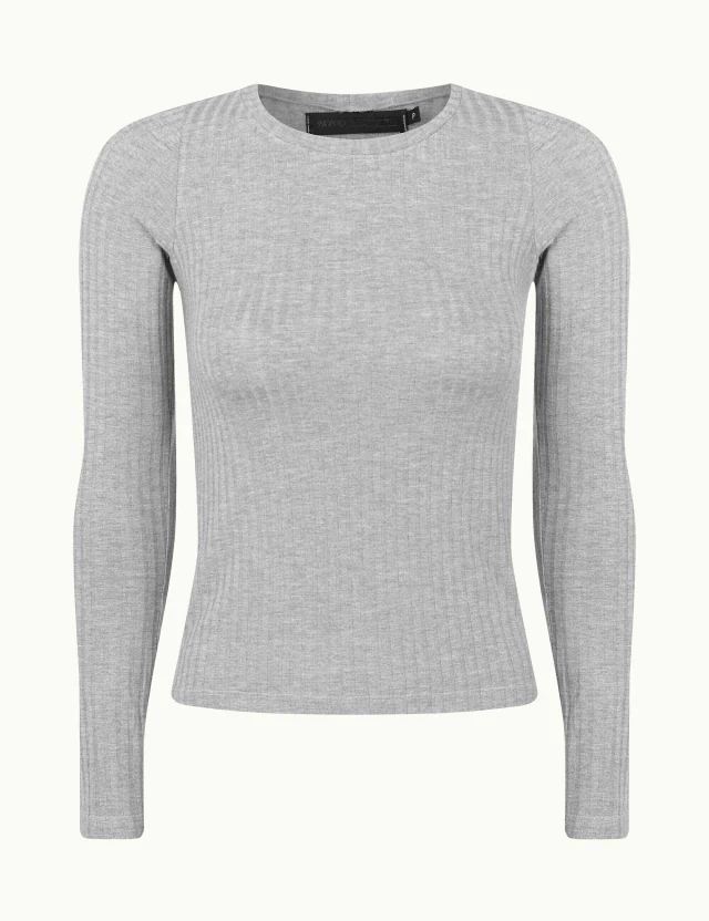 A blusa de malha canelada oferece elegância com seu toque texturizado, gola redonda e mangas longas, enquanto o caimento reto e a barra galoneira garantem sofisticação.