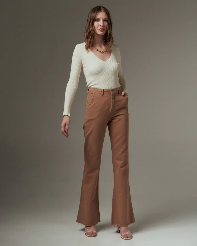 Calça flare produzida em sarja, modelagem flare com cintura média alta, bolsos faca e barra corte a fio.