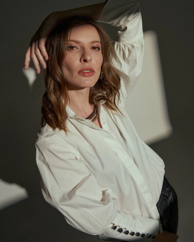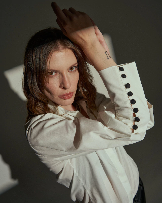 Possui o caimento soltinho, mangas longas com detalhe de botões pretos.