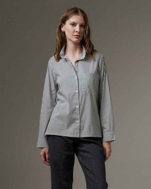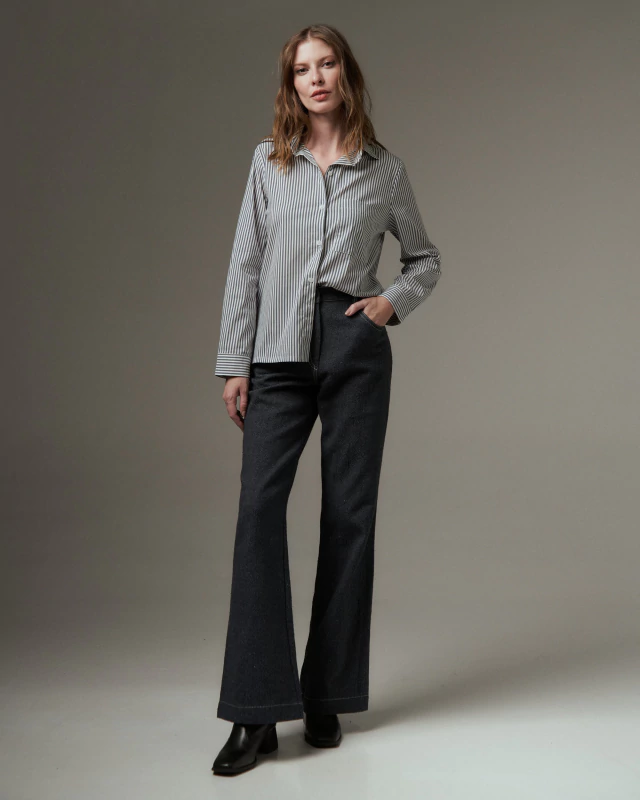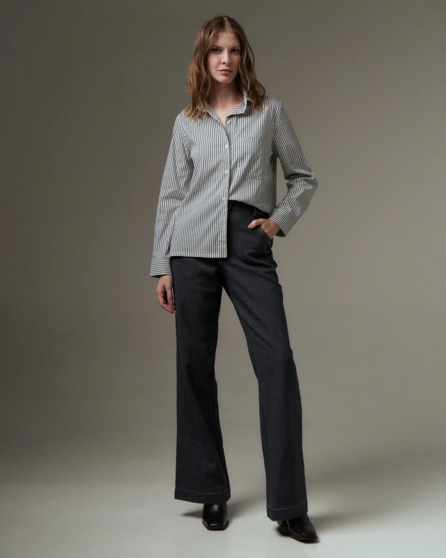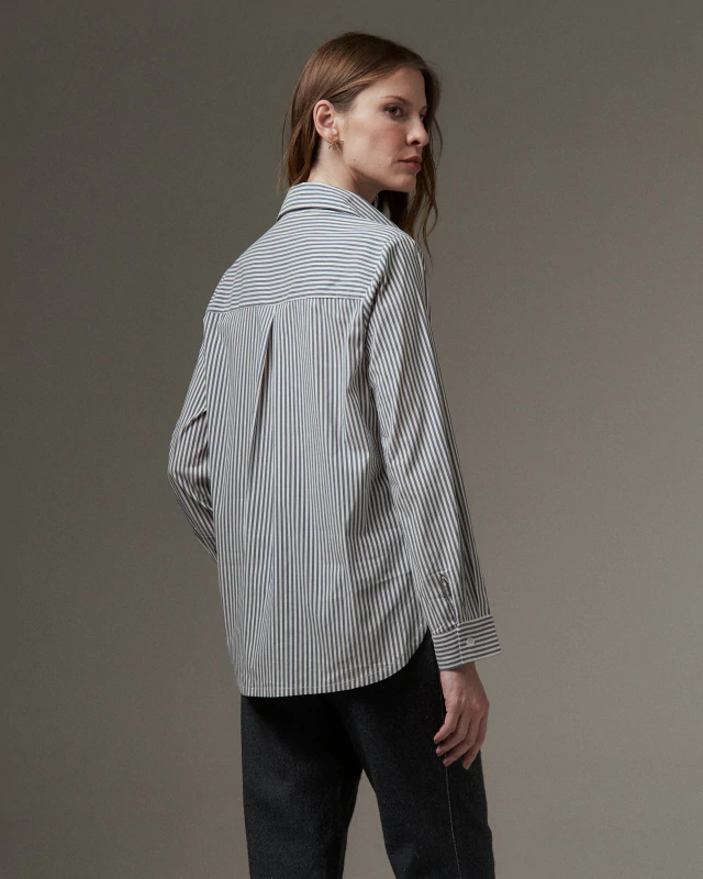 Camisa desenvolvida em tecido plano listrado. Possui o caimento soltinho e o comprimento alongado com botões frontais e no nos punhos.