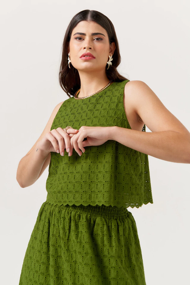 Conjunto produzido em laise, a regata possui decote redondo, fechamento por botão posterior, comprimento curto, shape solto, tamanho padrão com modelagem regular, possui forro. A saia possui o cós de elástico, cintura alta e comprimento midi com forro.