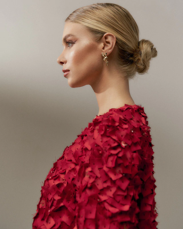 Modelo de mangas curtas, comprimento curto, todo bordado em cristais Swarovski em recortes de crepe acetinado.
