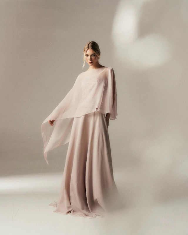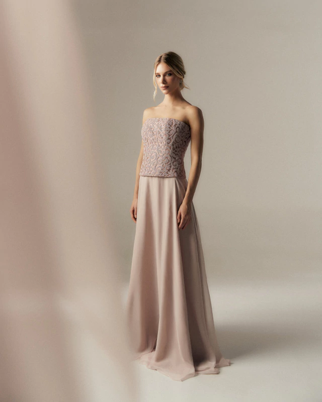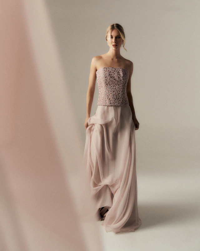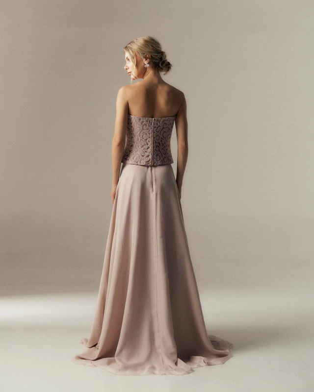 Corset modelagem tomara que caia, com renda bordada e saia godê em mousseline.