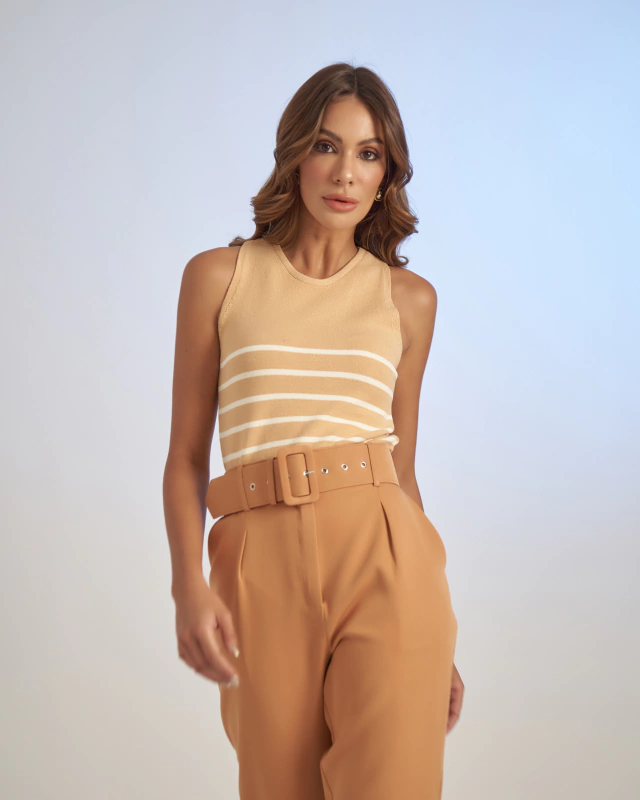Regata produzida em tricot modal todo cabelado com listras, um tecido confortável com toque agradável.