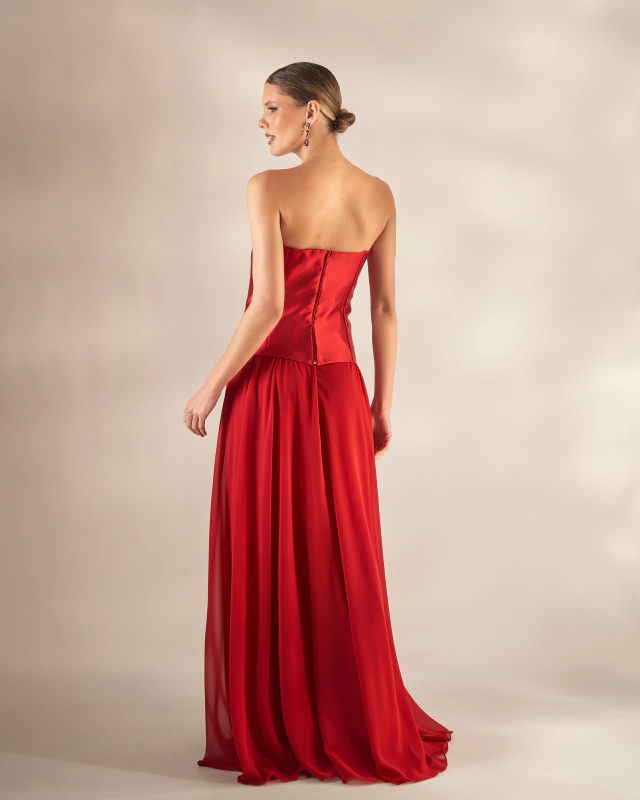 Saia ampla desenvolvida em tecido georgette, cintura alta com forro e fechamento por zíper.
