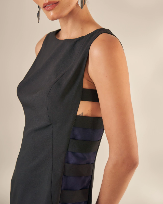 Seu design apresenta um decote canoa que confere um toque de charme, enquanto as fendas laterais adicionam movimento e sensualidade na medida certa. O vestido é sem mangas e conta com forro embutido, garantindo conforto e acabamento impecável.