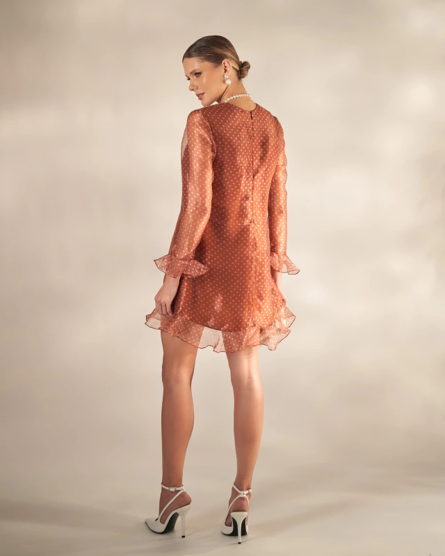 Modelo de comprimento curto, levemente solto, com gola redonda, mangas longas com acabamento de babados nos punhos e barrado.