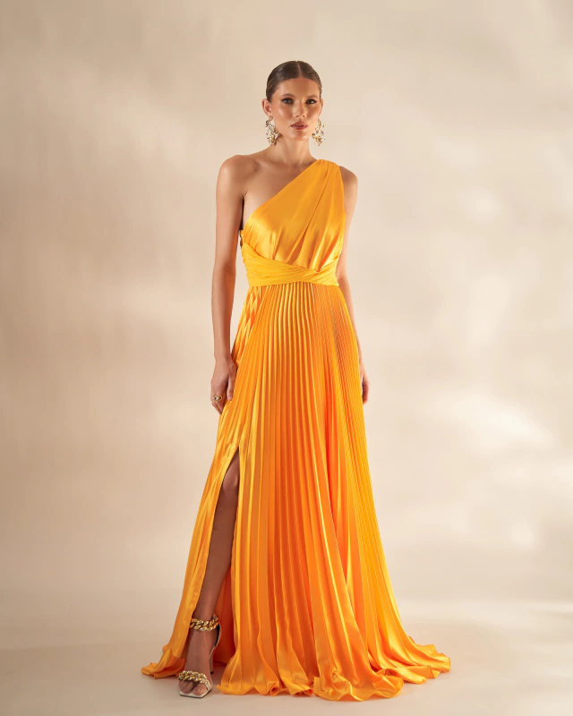 Com saia plissada, ombro só e um delicado detalhe de faixas na parte posterior, trazendo sofisticação e charme ao visual.