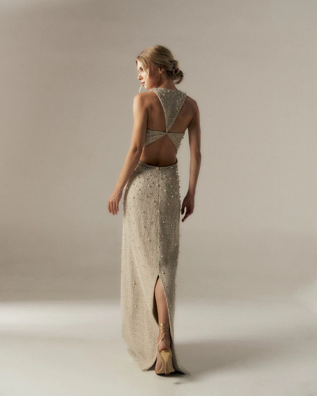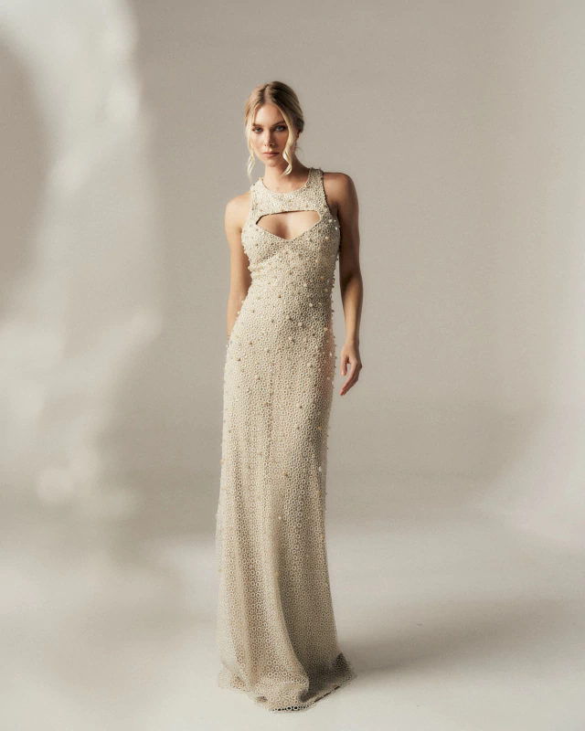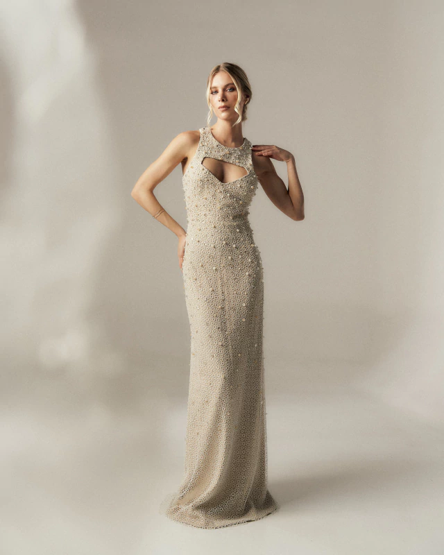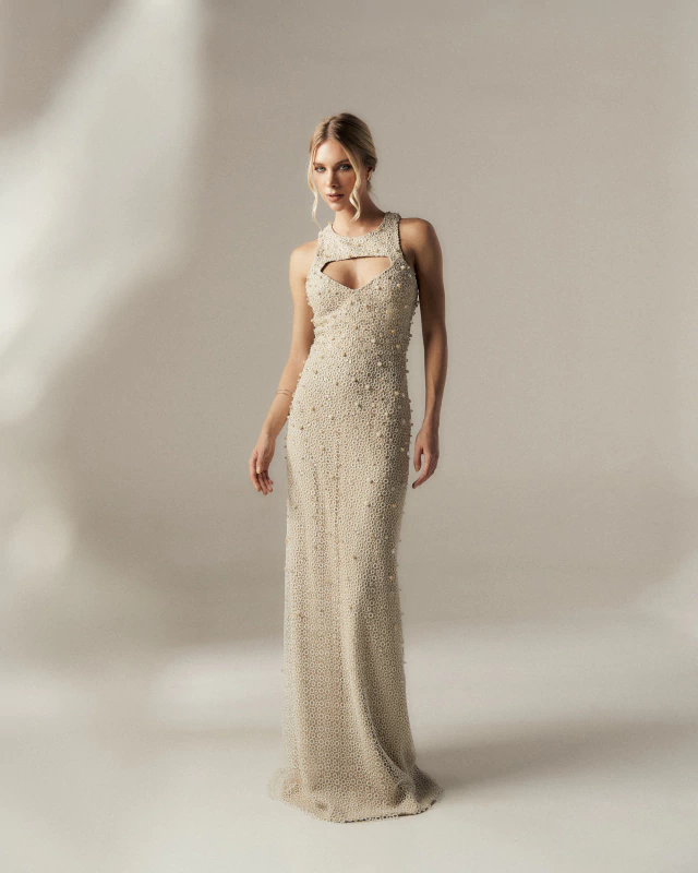 Vestido de festa longo, em guipir bordado com cristais, ajustado ao corpo. Possui recorte no decote frontal e posterior.