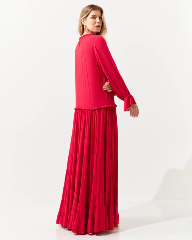 Vestido desenvolvido em tecido plano leve. O modelo amplo possui o caimento soltinho. As mangas são longas com babados e o decote V com cordões para amarração.